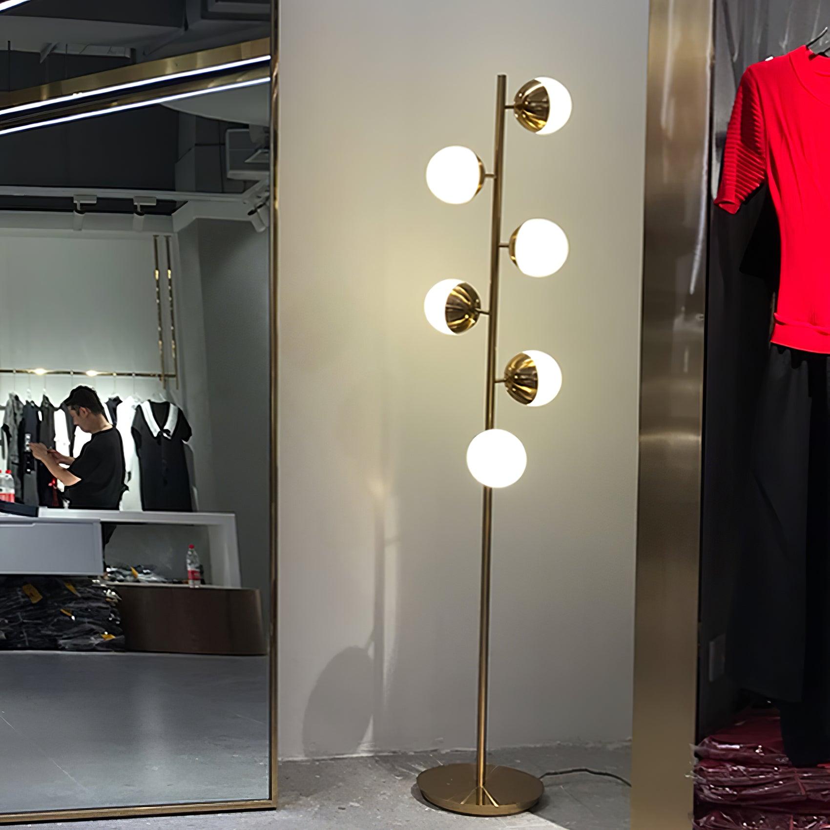 Le mât doré et les boules de verre créent une ambiance à la fois moderne et intemporelle, tandis que la base lourde garantit une stabilité optimale. Cette lampe s'intègre parfaitement dans des espaces tels que les salons, les bureaux ou les couloirs.
